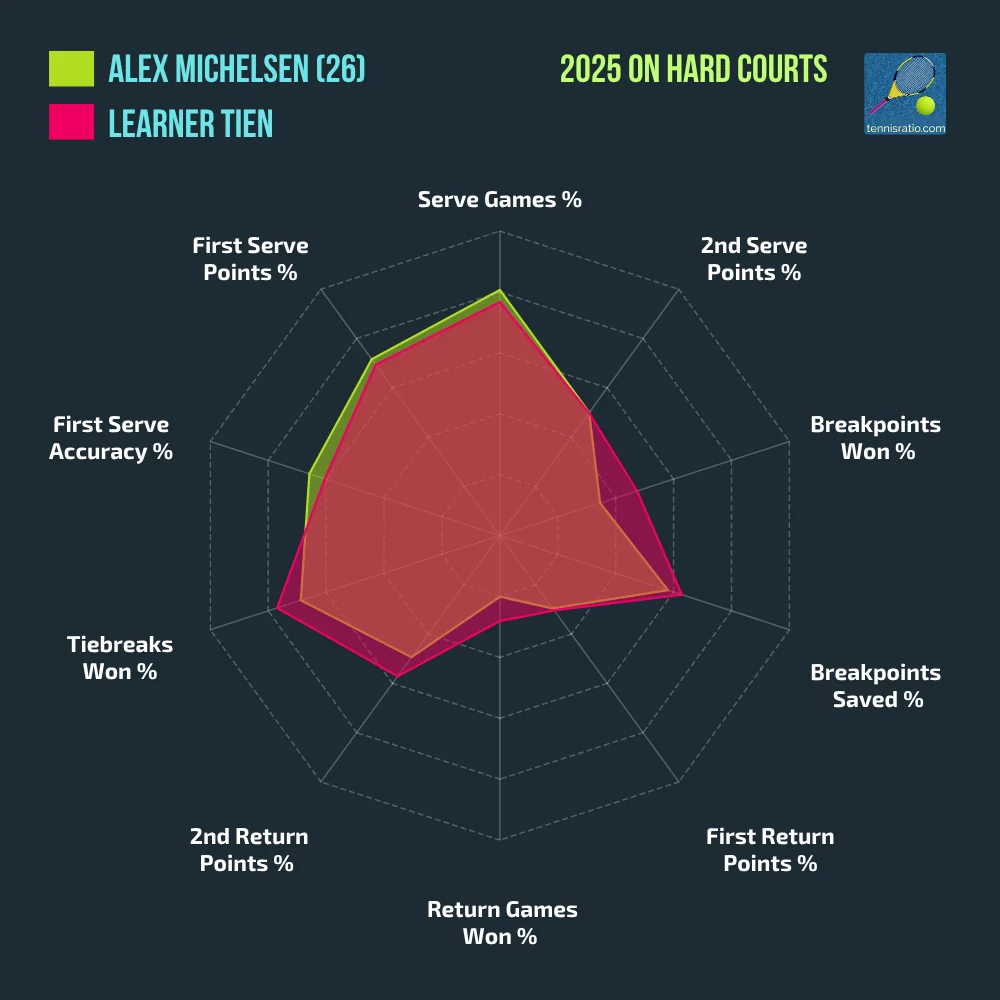 Musetti won the first set 6-3 with a really clean performance, hitting some strong winners and not facing a single breakpoint. He could’ve moved ahead in the second set as well, but Michelsen defended a breakpoint in the opening game. The American started to take more initiative and was rewarded with a second-set win in a tiebreak. The third set started more erratically. Musetti took an early lead, but Michelsen raised his level impressively, coming back from 0-2 down to win the match 3-6, 7-6(4), 6-4. He dominated in decisive games and hit a brilliant 22 winners in the third set. He faced much more pressure on serve (37 points) compared to the 24 created on return, but defended the most crucial moments—especially the aforementioned breakpoint in the second set, which could’ve made the match one-sided.