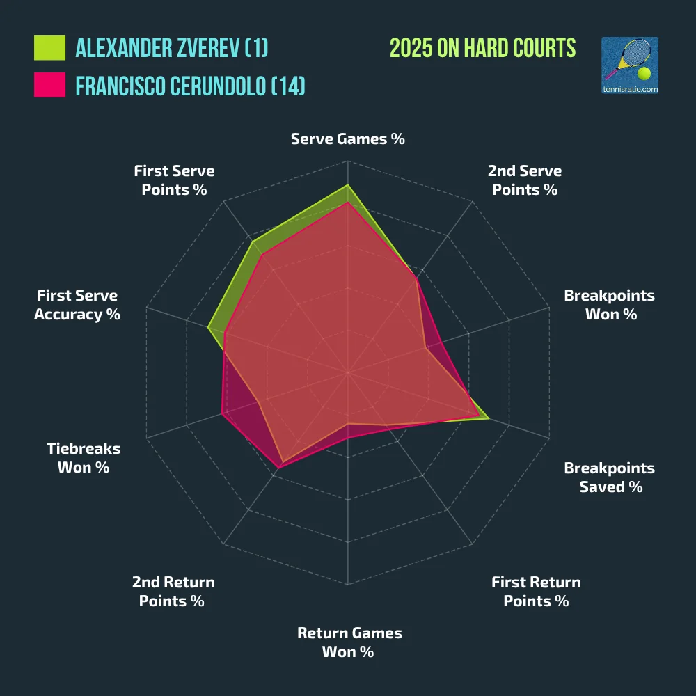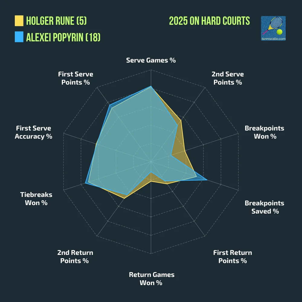 Alexei Popyrin meets another big name who has struggled in 2025. However, 5th seed Holger Rune has had a solid start in Toronto, not only avoiding set losses but not facing a single breakpoint yet (!) in his matches against Alexandre Muller and Giovanni Mpetshi Perricard. He faced just two pressure points against Muller and four against Perricard—all of which he saved. Continuing this impressive serving performance, he will be a much tougher opponent for Popyrin than Medvedev was on a vulnerable day.