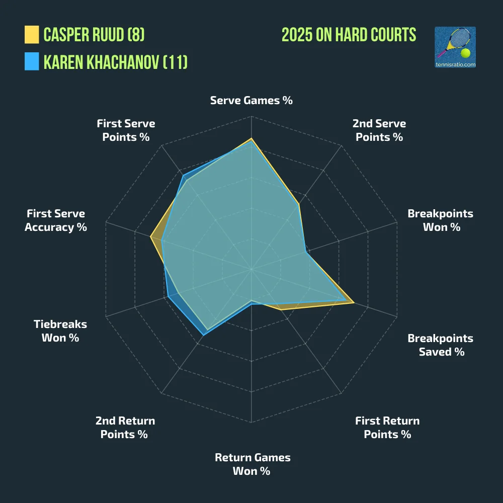Karen Khachanov and Casper Ruud meet in a high-profile clash without a clear favorite. Khachanov, the current Wimbledon quarterfinalist, had to come back from a set down against Emilio Nava, eventually winning 6-7(6), 6-4, 6-1. Ruud reached the Round of 16 after routine straight-set wins over Roman Safiullin and Nuno Borges. The Norwegian has also won both previous meetings with Khachanov—the last being a significant one in the 2022 US Open semifinal.