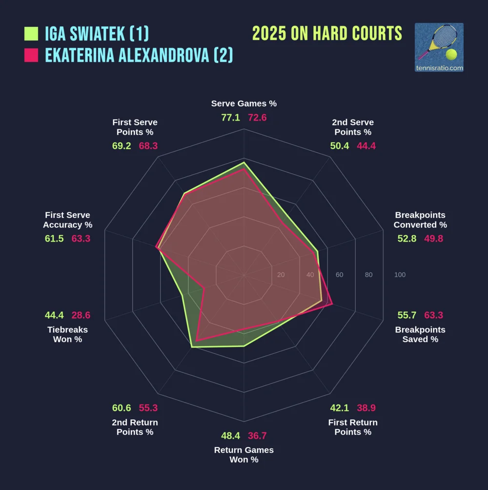 Swiatek is a favorite to win her second title on hard courts this year and first WTA 500 trophy since 2.5 years. She leads the head-to-head against the Russian by 5-2 including the one-sided victory in the US Open three weeks ago. Swiatek has executed her game plan perfectly, ending the impressive run of Alexandrova who dominated her first three opponents. The second seed is more than solid this year, excelling on hard courts with 8 wins in the last 10 matches. It's Alexandrova's second consecutive WTA 500 final run after losing to Diana Shnaider in Monterrey's title match last month.