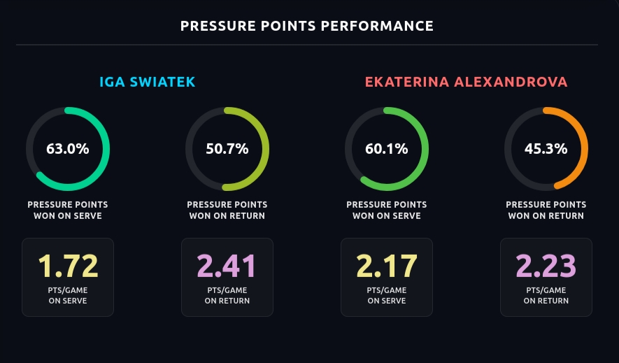 The semifinal of the top half got emerged between Swiatek and Maya Joint. The Australian performed quite an upset over world number 12 Clara Tauson. Not just the outcome, but the extent of it was surprising, as Joint won the opening set 6-0. Tauson regrouped since the start of the second set, but the Australian came back to her top level, winning 5 games since being down 1-3 to win it all by 6-0 6-3. The 19-year-old did not manage to make another upset, getting beaten by Swiatek in just a few minutes more than an hour with another one-sided score that day - 6-0, 6-2. Despite the crushing scoreline, Joint was able to create pressure points on Swiatek's serve but won just 6 of 19 produced and especially won 5 out of 17 on her own serve, easily cracking under pressure.