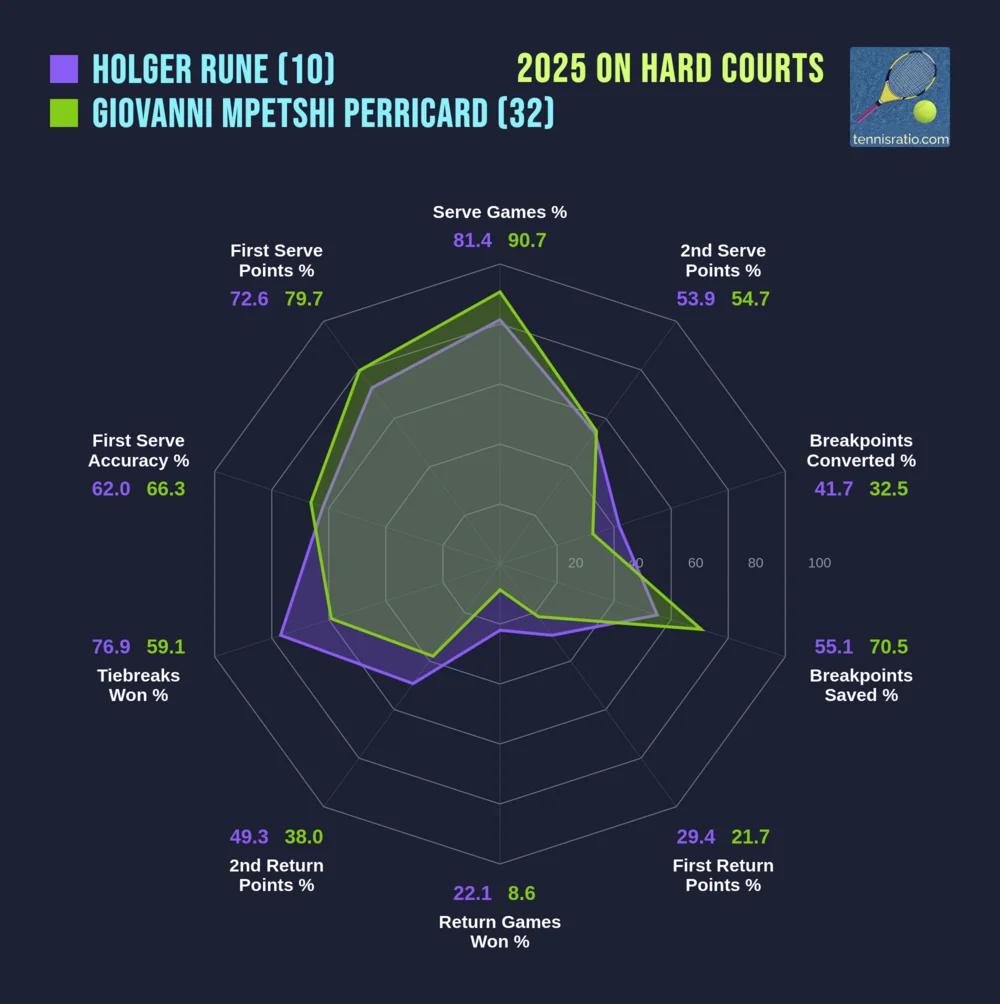 The key to the match will be whether Rune can break Mpetshi Perricard's serve - a task that proved impossible for Fritz. The Frenchman serves with speed often exceeding 230 km/h, but his return game is a real liability, which the Dane should exploit.