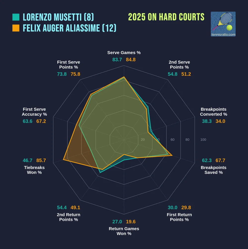 Felix Auger Aliassime showed a resillience in crucial moments of his match against Jesper De Jong. The world number 81 was staying in contention in both sets against the favorite and had two setpoints on the Canadian's serve in a shaky second set, but Auger Aliassime came out of trouble to win the whole match by 6-4 7-5. Lorenzo Musetti had also have to put a fight in his all-Italian clash against Luciano Darderi. The 26th seed not performs well on hard courts this year, but was competitive against his higher ranked fellowcountry who needed more than two hours to take the win by 7-5 7-6(1) with 11 aces scored and impressive amount of 44 winners.