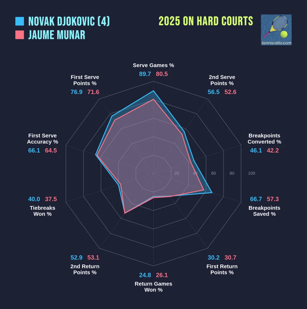 Jaume Munar is experiencing his best season on hard courts - 18-11, which represents breakthrough for a player mainly associated with clay courts. The Spaniard reached career-high ranking of 37th after making fourth round at US Open, where he lost to Musetti. In Shanghai, Munar continues his revelatory form defeating Marton Fucsovics after dropping a set, Flavio Cobolli and Yoshihito Nishioka 6-4 5-7 6-1. In that last match, Munar fired 12 aces and won 74% of first serve points - it's the first time he reached round of 16 at Masters 1000 on hard courts. The 28-year-old won 27 out of 51 matches this season, and his game is based on consistency developed on clay courts - long and powerful rallies from the baseline with heavy topspin forehand.