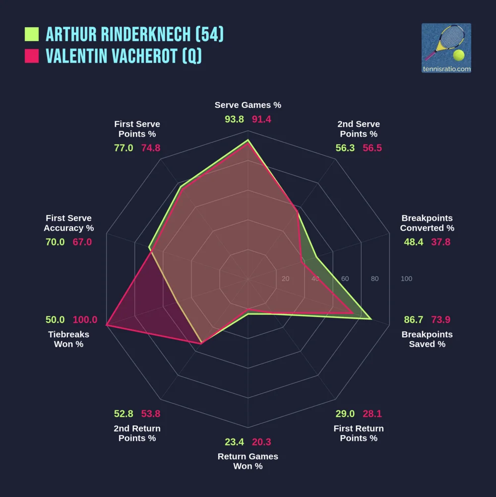 The statistical comparison from their main draw matches in Shanghai favorizes Rinderknech a little bit. Both rely on serve very much in their run winning more than 90% of their service games, having simillar records of first serve points (77% - 75% for Rinderknech) and second serve (both ~56.5%). The older of cousins excells in clutch moments - the resillience during breakpoints was his biggest weapon in that sensational run. He saved 86.7% of breakpoints in compare to Vacherot's 73.9% and converted 48.4% of return chances to Vacherot's 37.8%.