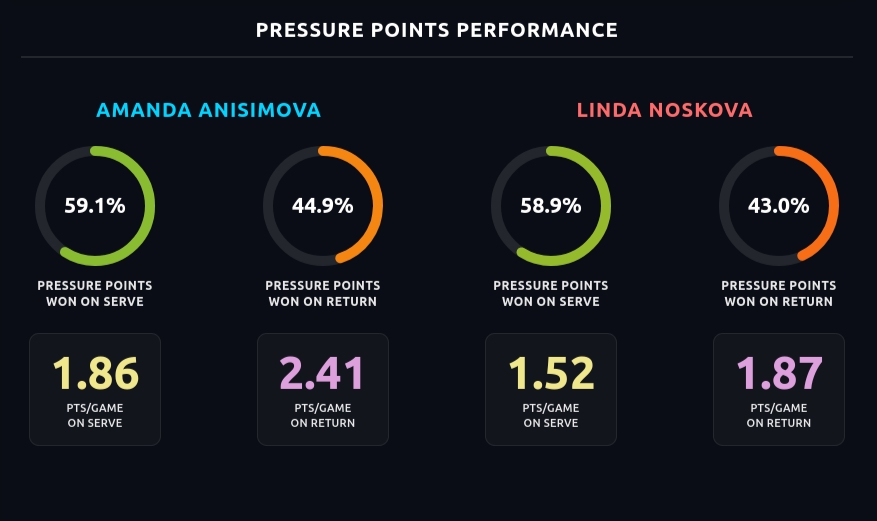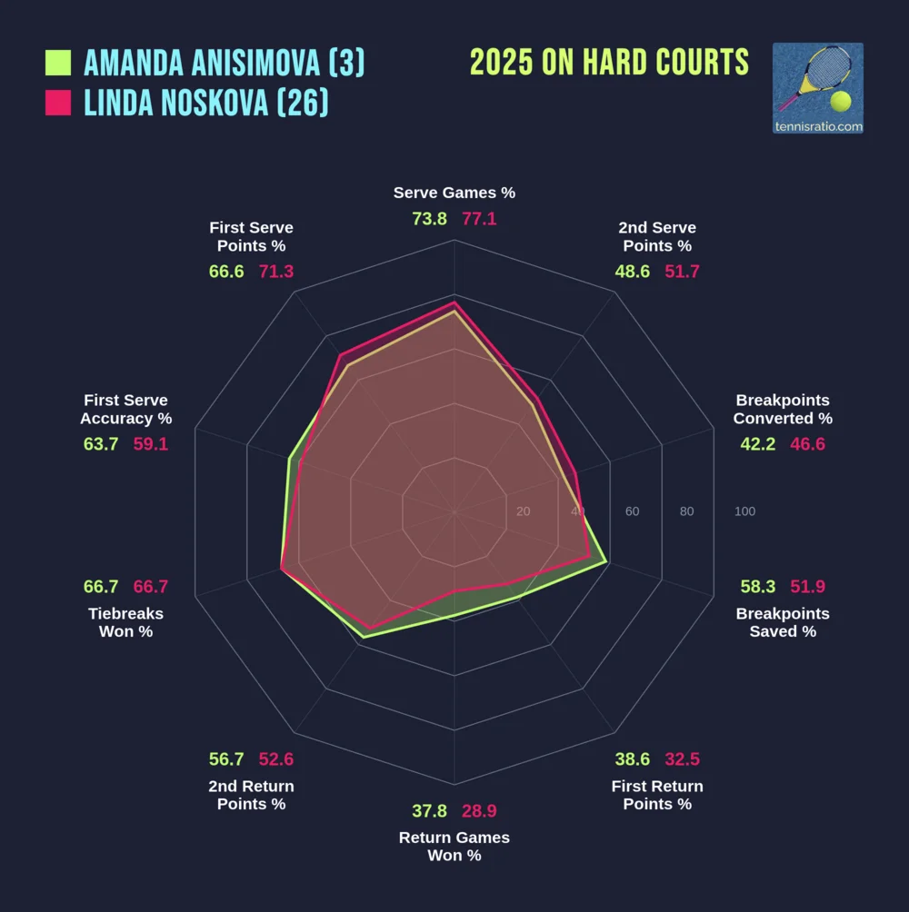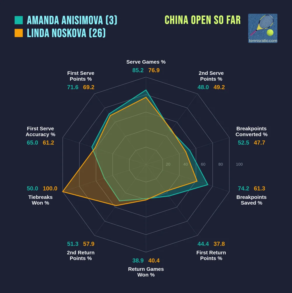 Anisimova seems to rely on her serve very well, but according to the stats, it's Noskova who records better serving numbers throughout the whole season on hard courts - 77% to 74% of service games won, 71% to 67% of first serve 52% to 49% of second serve points. However, Anisimova plays much over her average in Beijing, winning 85% of service games to Noskova's 77%, and especially being clutch in crucial moments - 52.5% of breakpoints converted and 74% of breakpoints saved.
