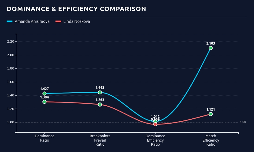 Recent few weeks looks like Anisimova's resurgence and finding the new level of lethality and consistency which can make her a new top contender to biggest titles in longer perspective alongside Aryna Sabalenka and Iga Swiatek. She shows abilities to overplay every opponent on tour with her hard and clean hitting. Anisimova produces 2.41 pressure points on average in return game in compare to Noskova's 1.87 on hard courts in 2025, however Noskova faces 0.34 pressure point less on average in service games. Anisimova's tools translate into winning matches very well, with her match efficiency ratio twice as high as her Sunday's opponent's. Noskova was very consistent since the start of a season but is still yet to clinch any title in 2025. Winning on Sunday would be best reward for the strongest season in her career so far, however Anisimova looks unstoppable if she brings the level from match against Gauff for instance. Both played twice so far - Noskova won their only meeting on hard in 2023, Anisimova prevailed in tight three-setter in round of 16 of Wimbledon three months ago.