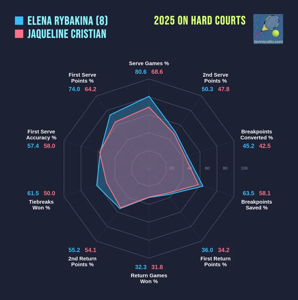 Elena Rybakina starts her Wuhan campaign to bounce back after upset served by Eva Lys at the start of previous event in Beijing. It's another top tier player in a stacked upper quarter of a draw alongside Sabalenka, Osaka and Noskova. Rybakina meets Jaqueline Cristian. The Romanian came back from a set down after to defeat Mccartney Kessler by 6-7(6) 6-0 6-3. The opening set lasted 82 minutes, where Cristian forced a tiebreak from double break down since the start. She not managed to grab that set but fully dominated the on-court events since then to score her 17th win in 30 matches on hard courts this year.