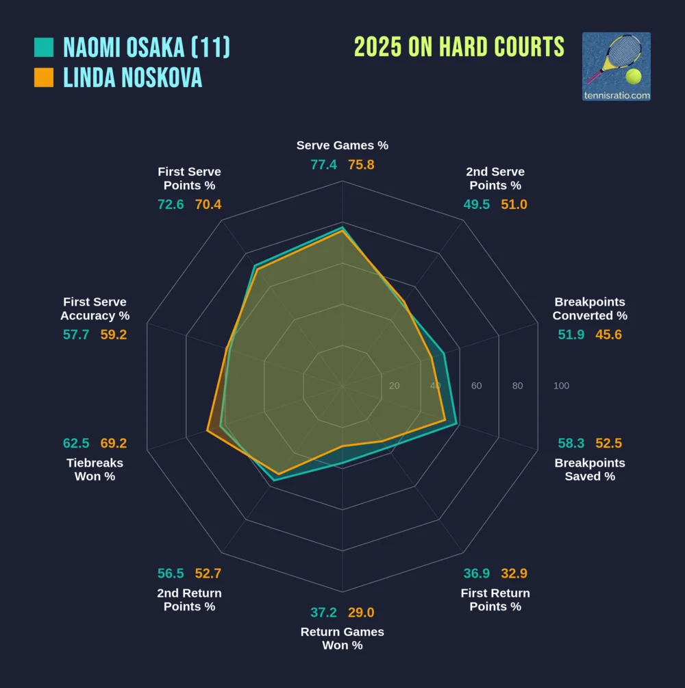 Naomi Osaka sets up another exciting match-up after today's win over Fernandez, playing against the recent WTA 1000 China Open runner-up and new world number 17 - Linda Noskova. That will be a meeting of two of range of most efficient serving players in the field on hard courts this season. Both thrive on that surface in 2025 - Osaka's record is 22-8 including the recent runs into final in Canadian Open and semifinal in US Open. The fatigue of young Czech is somewhat a question mark, as she played a very demanding three-setter against Yulia Putintseva ended in decisive tiebreak with a score 6-4 4-6 7-6(2), where Noskova came back from 1-3 down in third set. That was just two days after competing in final of China Open against Amanda Anisimova, who decided to withdraw from event in Wuhan.