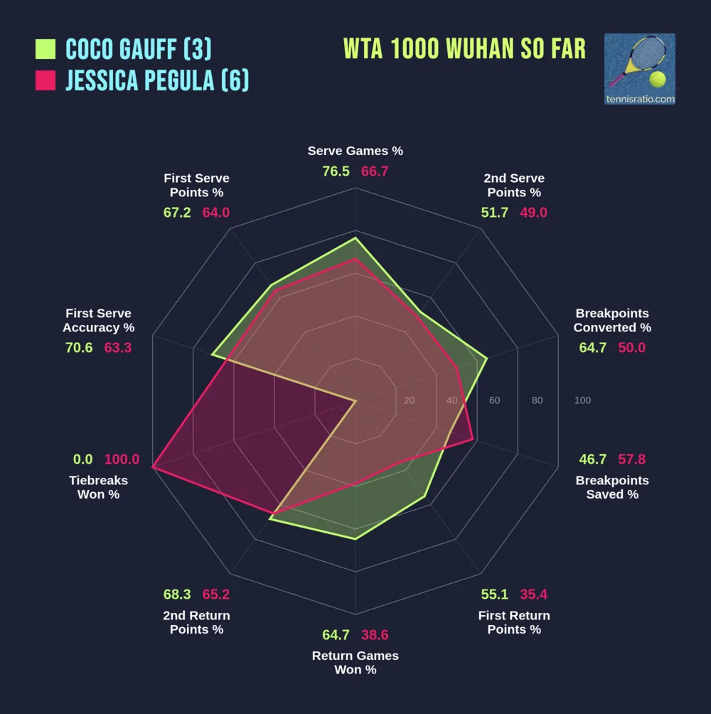 Gauff enjoyed quite a formidable path in a draw, which was very stacked in other parts - especially in top half. Paolini was the only top 50 player on her road to final. That might be one of the reason of quite huge discrepancy of statistical comparison between both from their matches played in Wuhan so far. Despite poor serving performance in semifinals, Gauff won 10% more of service games (76 to 66), and about 3% more of first serve (67 to 64) and second serve (52 to 49) points. The advantage in return stats in huge - Gauff was lethal returning first serve of her opponents (55% to Pegula's 35%) and won exceptional 64.7% of return games in Wuhan (to Pegula's 38.6%) which is the biggest difference between both finalists. Both were similarly efficient in attacking second return - 68% to 65% for Gauff.