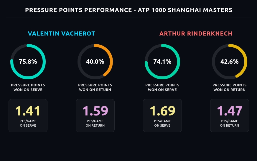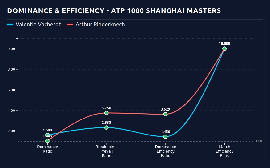 This year's Roland Garros champiandon was also more dominant in terms of creating and winning breakpoints (dominance & efficiency chart). Pegula needed to face almost whole one pressure point on average each service game (2.23 to 1.32). Both produced more than 2 pressure points on average in return games, with another significant advantage of Gauff (2.41 to 2.07). All those stats including with Pegula's fatigue can indicate Gauff as a favorite, however today's remarkable comeback of the world number six which ended Sabalenka's undefeated run of 20 victories in Wuhan suggests to not write-off her chances at any point.