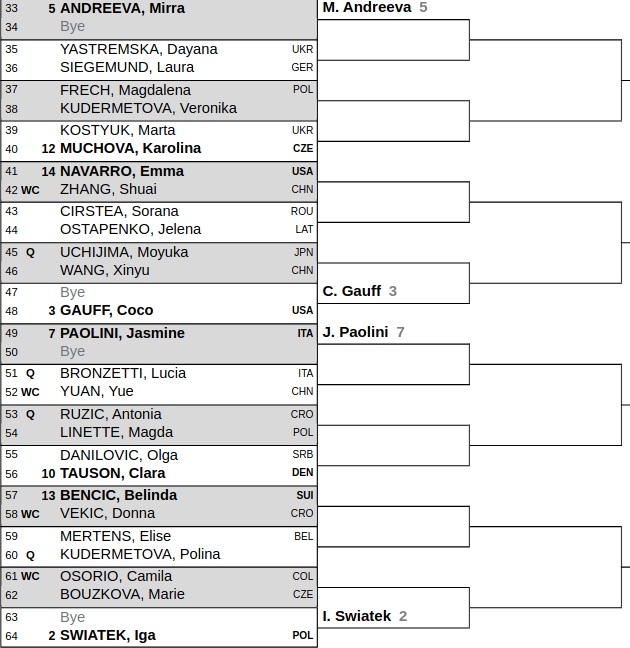 Third seed Coco Gauff displayed a decent performance in Beijing up to the semifinal match, where she got absolutely crushed by Amanda Anisimova - not much by her own liabilities, but just being overplayed by the fellow American. The world number three is still yet to win a tournament on hard courts in 2025. She can face Emma Navarro in round of 16. The run in Beijing and victory against Swiatek was somewhat a revival after miserable part of season played by the 14th seed. Mirra Andreeva is Gauff's projected quarterfinals opponent as 5th seed. The Russian will try to regroup after two disappointing runs in US Open and Beijing. She can meet Karolina Muchova in round of 16. The Czech plays the most interesting match of first round in third quarter, meeting Marta Kostyuk for the start.
